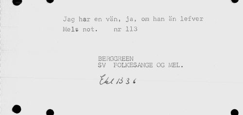 //// Jag har en vän, ja, om han än lefver //// Mels not. nr 113 //// BERGGREEN //// SV FOLKESANGE OG MEL. //// ^ /J ^ ^ ////