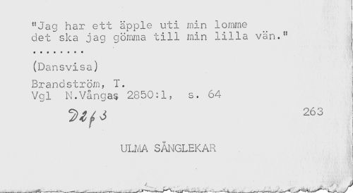 //// "Jag har ett äpple uti min lomme //// det ska jag gömma till min lilla vän." //// i //// #** + * + ** //// (Dansvisa) ) //// Brandström, 1. //// Vgl N.Vånga$ 2850:1, s. 64 //// 263 //// UL?/A SÅNGLEKAR //// , - - ' '. , v I //// . ' * ; i //// B! //// < " t ^' Q ////