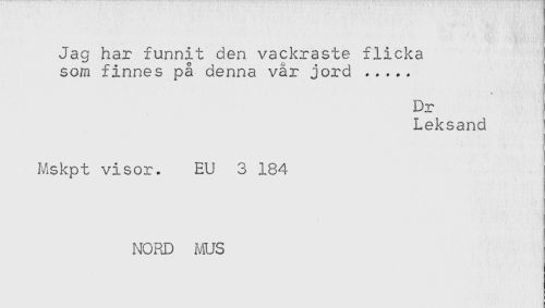 //// Jag har funnit den vackraste flicka //// som finnes på denna vår jord ..... //// Dr //// Leksand //// Mskpt visor. EU 3 184 //// NORD NIUS ////