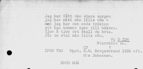 //// Jag har fått den stora sorgen //// jag har mist min lilla vän - //// man jag har den enda trösten //// att han kommer igen till hösten, //// ljuv a tjuv det skall du heta, //// för du stal min lilla vän. //// Vg D 224 //// Starrkärr sn. //// C? ? //// ^ IFGH 750 Uppt. E.M. Bergsterand 1926 ef! //// ^ Ht a Johnsson. //// NORD ms ////