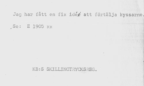 //// Jag har fått en fix ide/ att förtälja kyssarne. //// ^Se: E 1905 xx //// . //// . //// KB:S SKILLINGIRYCKSP^G. ////