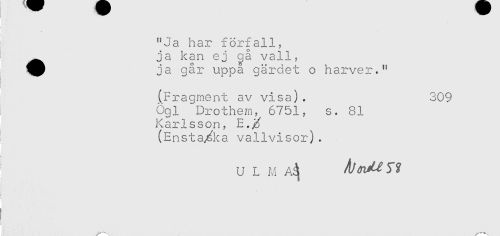 //// ! //// "Ja har förfall. //// ^^ ja kan ej cjå vall, //// ja går uppa gärdet o harver." //// i //// (Fragment av visa). 309 //// ögl Drothem, 6751, s. 81 //// Karlsson, E.^ //// (Ensta/ka vallvisor). //// U L M A^ //// t ////