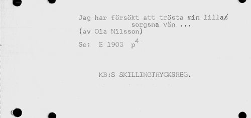 //// Jag har försökt att trösta min lilla/ //// sorgsna vän ... //// (av Ola Nilsson) //// Se: E 1903 p^ //// i //// i //// KB:S SKILLINGTRYCKSREG. //// ) //// ^ — ////