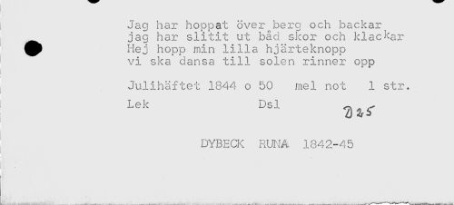 //// ] Jag har hoppat över berg och backar^ //// jag har slitit ut bad skor och klackar //// ' ^jp Hej hopp min lilla hjärteknopp //// ' vi ska dansa till solen rinner opp //// Julihäftet 1844 o 50 mel not 1 str. //// Lek Dsl ^ //// ) //// DYBECK RUNA 1842-45 //// j ////