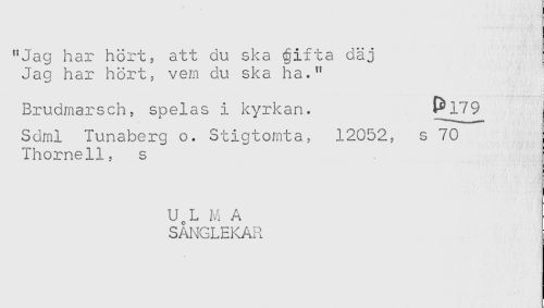 //// "Jag har hört, att du ska ^ifta däj //// Jag har hört, vem du ska ha." //// Brudmarsch, spelas i kyrkan. //// Sdml Tunaberg o. Stigtomta, 12052, s 70 //// Thornell, s //// U L M A //// SÅNGLEKAR ////