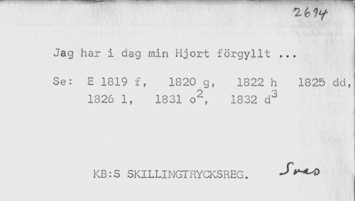//// Jag har i dag min Hjort förgyllt ... //// Se: E 1819 f, 1820 g, 1822 h 1825 dd, //// 1826 1, 1831 o^, 1832 d^ //// KB: S SKILLINGTRYCKSREG. ////