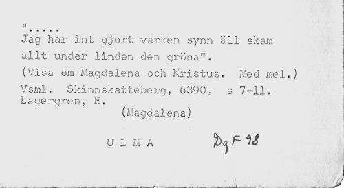 //// H //// * * # + * //// Jag har int gjort varken synn äll skam //// allt under linden den gröna". //// (Visa om Magdalena och Kristus. Med mel.) //// Vsml. Skinnskatteberg, 6390, s 7-11. //// Lagergren, E. //// (Magdalena) //// i //// ) //// U L M A f ^ ////