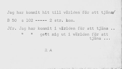 //// Jag har kommit hit till världen för att tjänad //// B 50 s 102-----2 str. kom. //// Jfr. Jag har kommit i världen för att tjäna .. //// " " qeUt mig ut i världen för att //// tjäna ... //// R A ////