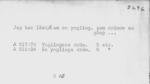 //// Jag har läst/å om en yngling? som drömde en //// gång ... //// A 517:70 Ynglingens dröm. 5 str. //// A 516:24 En ynglings dröm? 5 " //// R ////