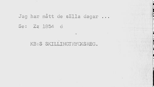 //// Jag har nått de sälla dagar ... //// Se: Zz 1854 d //// ! //// KB:S SKILLINGTRYCKSREG. F //// < //// L //// L- ////