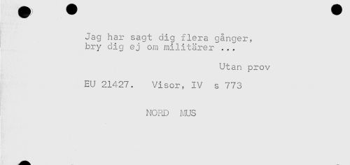 //// Jag har sagt dig flera gånger, //// bry dig ej om militärer ..^ //// Utan prov //// EU 21427. Visor, IV s 773 //// NORD MUS ////