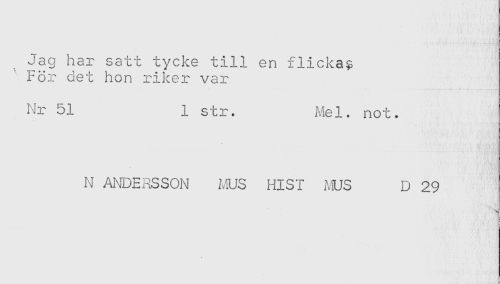 //// Jag har satt tycke till en fl.icka$ //// För det hon riker var //// Mr 51 1 str. Mel. not. //// N ANDERSSON MUS HIS1 MUS D 29 ////