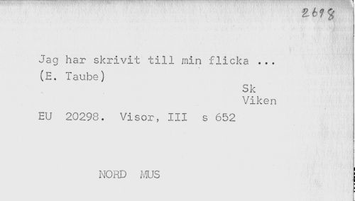 //// Jag har skrivit till min flicka ... //// < //// (E. Taube) //// Sk //// Viken //// EU 20298. Visor, III s 652 ////