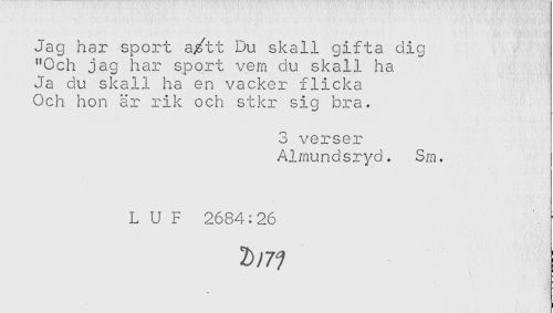 //// Jag har sport a/tt Du skall gifta dig //// "Och jag har sport vem du skall ha //// Ja du skall ha en vacker flicka //// Och hon är rik och stkr sig bra. //// 3 verser //// Almundsryd. Sm. //// L U F 2684:26 ////
