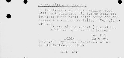 //// Ja har sålt e krocka nu, //// En fruntimmersrad och en karlrad stod //// mitt emot vanandra. Så tar en karl ett //// ^ fruntommer och skall sälja henne och an^ //// svarar för att hon är felfri. Sen sjung- //// er han: //// Ja har sålt e krocka (:kruka) nu, //// å den va' sprucken uti bunnen. //// Vg D 5. //// 1926/ Kalv sn. //// IrGH 753 Uppt E.M. Bergstrand efter //// A. L:a Karlsson f. 1837 //// NORD MUS ////