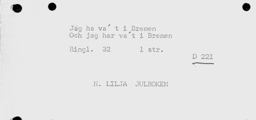 //// Jäg ha va' t i Bremen //// Och jag har va't i Bremen //// Ringl. 32 1 str. //// D 221 //// N. LILJA JULBOKEN ////