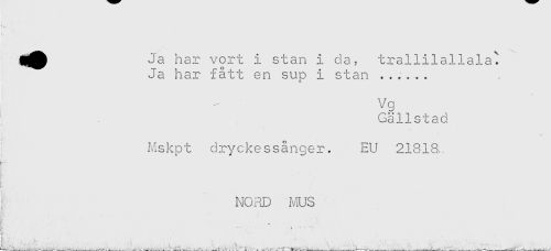 //// Dj^ Ja har vort i stan i da? trallilallalal! //// Ja har fått en sup i stan ...... //// Vg //// Gällstad //// Mskpt dryckessånger. EU 21318,. //// Ip-*' //// NORD MUS //// L - . " - - *- - - ////