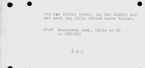 //// Jag har älskat fader, jag har älskat mor //// men mest jag lilla vännen haver älskat, //// i //// 8:6? Svenssons saml. häfte nr 16 //// s. 215-216 //// i //// i'' //// ! . ^ //// * //// ÅBO //// i //// i //// i . //// i ////