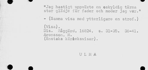 //// "Jag hastigt uppväxte en oskyldig tärna //// stor glädje för fader och moder jag var." //// <* //// - (Samma visa med ytterligare en strof.) //// (Visa). //// Dis. Råggärd, 16824, s. 31-35. 36-41. //// Aronsson, M. //// (Enstaka käråeksvisor). //// - //// U L M A //// ^^^^^^^ - . ////