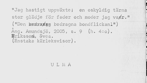 //// "Jag hastigt uppväxte; en oskyldig tärna ; //// stor glädje for fader och moder jag va/r." //// ("Den ia^xN^g bedragna bondflickan!") //// Ang. Anundsjö; 2005, s. 9 (h. 4:o). //// Erikssorå, Svea. ' //// (Enstaka kärleksvisor). ? //// ! //// U L M A ////