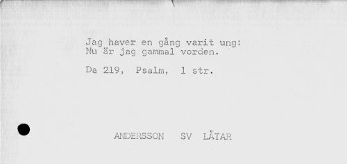 //// Jag haver en gång varit ung: //// Nu är jag gammal vorden. //// Da 219, Psalm, 1 str. //// ^ ANDERSSON SV LATAR ////