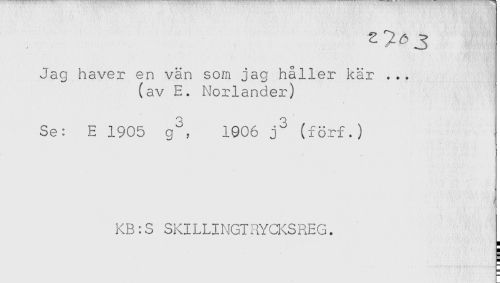 //// Jag haver en vän som jag håller kär ... //// (av E. Norlander) //// / //// Se: E 1905 g^, 1906 (förf.) //// KB:S SKILLINGTRYCKSREG. ////