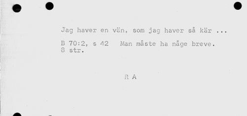 //// Jag haver en vän, som jag haver så kär ... //// B 70:2, s 42 Man måste ha någe breve. //// 8 str. //// f;, //// RA ////