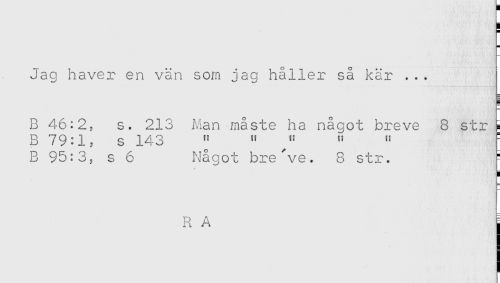 //// ) //// H //// Jag haver en vän som jag håller så kär . . . //// H //// B 46:2, s. 213 .Man måste ha något breve 8 str = //// B 79:1, s 143 " " " - //// B 95:3, s 6 Något bre've. 8 str. ' //// ) //// R A j ////