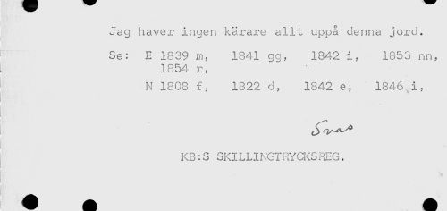 //// Jag haver ingen kärare allt uppå denna jord. //// Se: E 1839 m, 1841 gg, 1842 i, 1853 nn, //// t 1854 r, //// N 1808 f, 1822 d, 1842 e, 1846 i, //// . //// KB:S SKILLINGTRYCKSREG. //// I ////