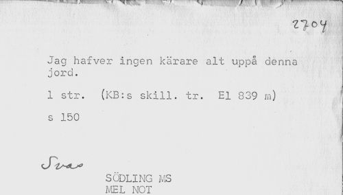 //// - //// - — - '*< ' T?'*-!' < '"'< '^'"Mt.-a //// Jag hafver ingen kärare alt uppå denna ! //// jord. //// 1 str. (KB:s skill. tr. El 839 m) //// s 150 //// i //// SODLING MS //// MEL NOT ////