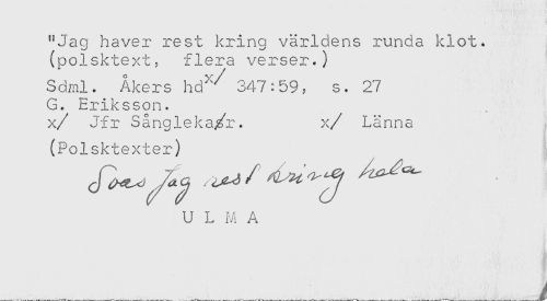 //// "Jag haver rest kring världens runda klot. //// (polsktext, flera verser.) //// Sdml. Åkers hd"^ 347:59, s. 27 //// G. Eriksson. //// x/ Jfr Sångleka/r. x/ Länna //// (Polsktexter) //// U L M A ////