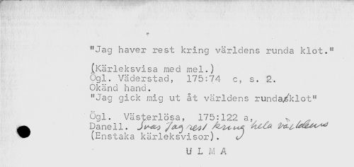 //// * ' //// t //// "Jag haver rest kring världens runda klot." //// * //// (Kärleksvisa med mel.) //// ögl. Väderstad, 175:74 c, s. 2. //// Okänd hand. //// "Jag gick mig ut åt världens runda/klot" //// ögl. Västerlösa, 175:122a, ^ . //// ^ Danell. J*^? /^j ^^^ //// ^^^ (Enstaka kärleksvisor). //// U L M A ////
