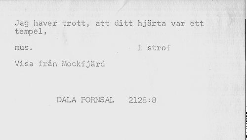 //// Jag haver trott, att ditt hjärta var ett //// tempel, //// mus. 1 strof //// Visa från Mockfjärd //// DALA FORNSAL 2128:8 //// i //// i //// i ////