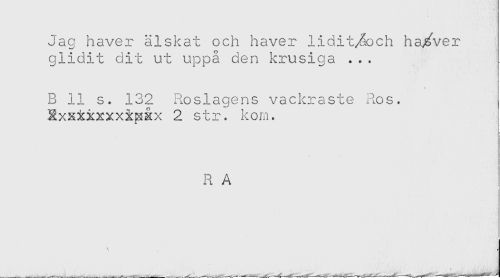 //// Jag haver älskat och haver lidit/åoch hafver //// glidit dit ut uppå den krusiga ... //// B 11 s. 132 Roslagens vackraste Ros. //// Rxxxxxxxi^åx 2 str. korn. //// R A ////