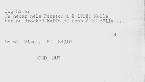 //// Jag heter //// Ja heder nels Parsson å S ifrån Mölle //// Har nu drocked kaffe mä dopp å rnä fölle ... //// Sk //// Mskpt Visor, EU 34910 //// i //// NORD i-,!US //// * ////