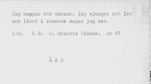 //// Jag hoppar och dansar, jag sjunger och ler //// och livet i rosenae dagar jag ser. //// 1:8. 6 B. O. Brandts Visbok, nr 97 //// ÅBO ////