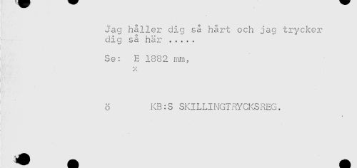 //// Jag håller dig så hårt och jag trycker //// dig så här ..... //// Se: E 1882 mm, //// x //// i //// i //// ö KB:S SKILLINGTRYCKSREG. //// < ////