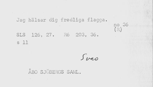 //// Jag hälsar dig fredliga flagga. //// no 36 //// (R) //// SLS 126, 27. R6 203, 36. //// s 11 //// ÅBO SJÖBERGS SAML. ////
