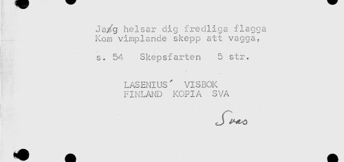 //// Ja/g helsar dig fredliga flagga //// Kom vimplande skepp att vagga, //// K ] //// s. 54 Skepsfarten 5 str. //// r ' -' ** * //// LASENIUS' VISBOK //// FINLAND KOPIA SVA ////