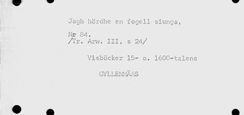 //// Jagh hördhe en fogeli slunga, //// Ns? 84. //// /Ir. Arw. III, s 24/ //// VisbOcker 15- o. 1600-talens //// GYLLENmRS ////