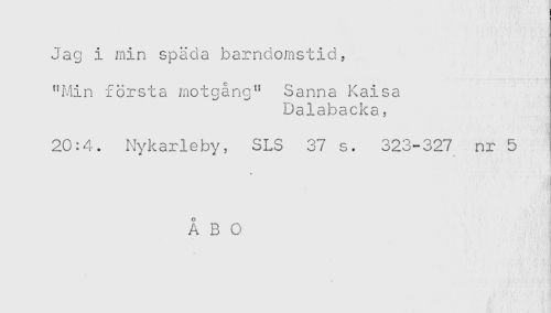 //// Jag i min späda barndomstid, //// "Min första motgång" Sanna Kaisa //// Dalabacka, //// 20:4. Nykarleby, SLS 37 s. 323-327 nr 5 //// * -' //// o //// A B O ////