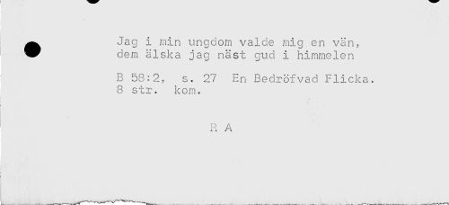//// ^^ Jag i min ungdom valde mig en vän, //// * dem älska jag näst gud i himmelen //// B 58:2, s. 27 En Bedrofvad Flicka. //// 8 str. kom. //// j //// i, A ////
