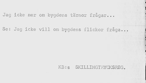 //// Jag icke mer om bygdens tärnor frågar... //// Se: Jag icke vill om bygdens flickor fråga... //// - //// ' i //// t //// t //// KB:s SKILLINGIRYCKSREG. ////
