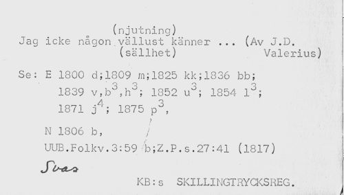 //// (njutning) //// Jag icke någon vällust känner ... (Av J.D. //// (sällhet) Valerius) //// Se: E 1800 d;1809 m;1825 kk;1836 bb; //// 1889 1852 u^; 1854 //// 1871 j^' ; 1875 p^, //// S //// f //// N 1806 b, //// UUB.Folkv.3:59 b;Z.P.s.27:41 (1817) //// KB:s SKILLINGTRYCKSREG. ////