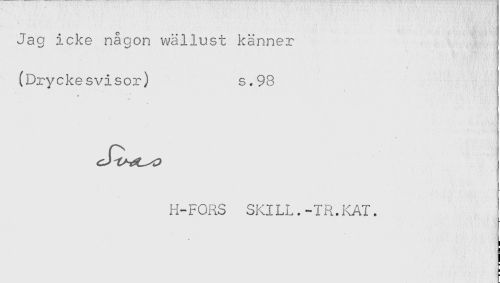 //// Jag icke någon wällust känner //// (Dryckesvisor) s.98 //// * //// H //// H-FORS SKILL.-TR.KAT. ////