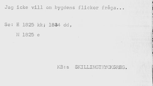 //// Jag icke vill om bygdens flickor fråga... //// Se: E 1825 kk; 1834 dd, //// N 1825 e //// KB:s SKILLINGTRYCKSREG. //// / ////