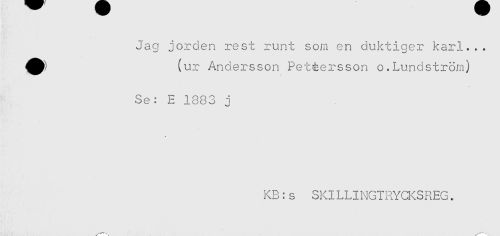 //// Jag jorden rest runt som en duktiger karl... //// (ur Andersson Petéersson o.Lundström) //// Se: E 1883 j //// KB:s SKILLINGIRYCKSREG. ////