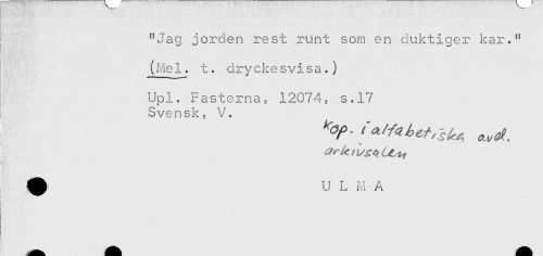 //// "Jag jorden rest runt som en duktiger kar." //// ! //// i //// (Mel. t. dryckesvisa.) //// Upl. Fasterna, 12074, s.17 //// Svensk, V. //// i, < //// i ^^ ^^ ^^ ^^ //// i //// ) //// t ////