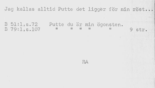 //// Jag kallas alltid Putte det ligger för min röst... //// B 51:l,s.72 Putte du är min ögonsten. //// B 79:1,s.107 " " " " ^ n 9 //// RA ////