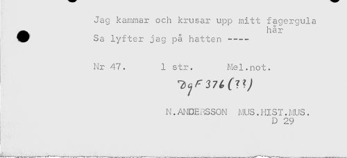 //// Jag kammar och krusar upp mitt fagergula //// ^^ Sa lyfter jag på hatten ---- //// Nr 47. 1 str. Mel.not. //// N.ANDEilSSON MUS.HISI.MUS. //// D 29 //// ! " ////